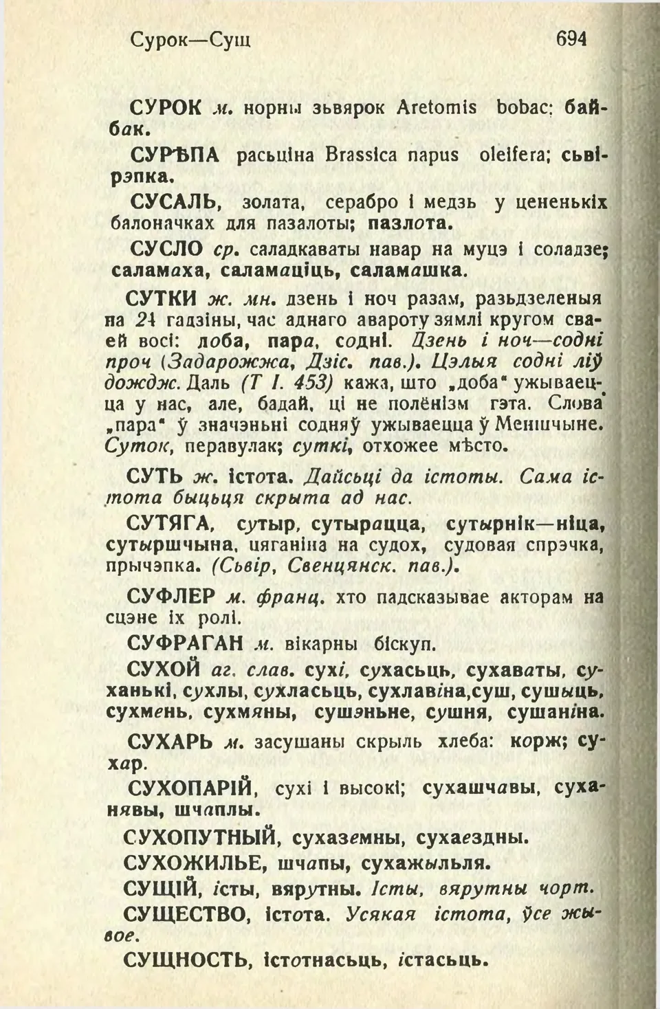 СУТКИ ж. мн. дзень i ноч разам, разьдзеленыя па 2\ гадзіны, час аднаго аваротузямлі кругом сваей восі: лоба, пара, содні. Цзень i ноч—содні проч (Задарожжа, Дзіс. пав.). Цэлыя содні ліў дождж. Даль (Т /. 453) кажа, што ядоба" ужываец-ў ца у нас, але, бадай, ці не полёнізм гэта. Слова* „пара* ў значэньні содняў ужываецца ў Меишчыне. Суток, перавулак; сутки отхожее мЪсто.